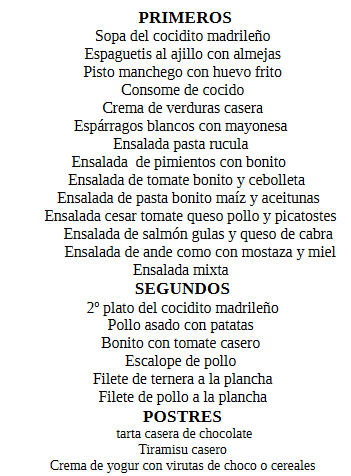 Para mediodía, qué mejor que poder degustar un rico menú diario en el que podrás elegir los platos que comer de la cocina tradicional española. Tenemos que contarte un secreto: no te vayas sin probar el cocido madrileño, es una de nuestras especialidades. ¿Quieres saber qué más cosas tenemos? Solo tienes que venir a visitarnos y empezar a disfrutar como nunca antes de comer fuera de casa.